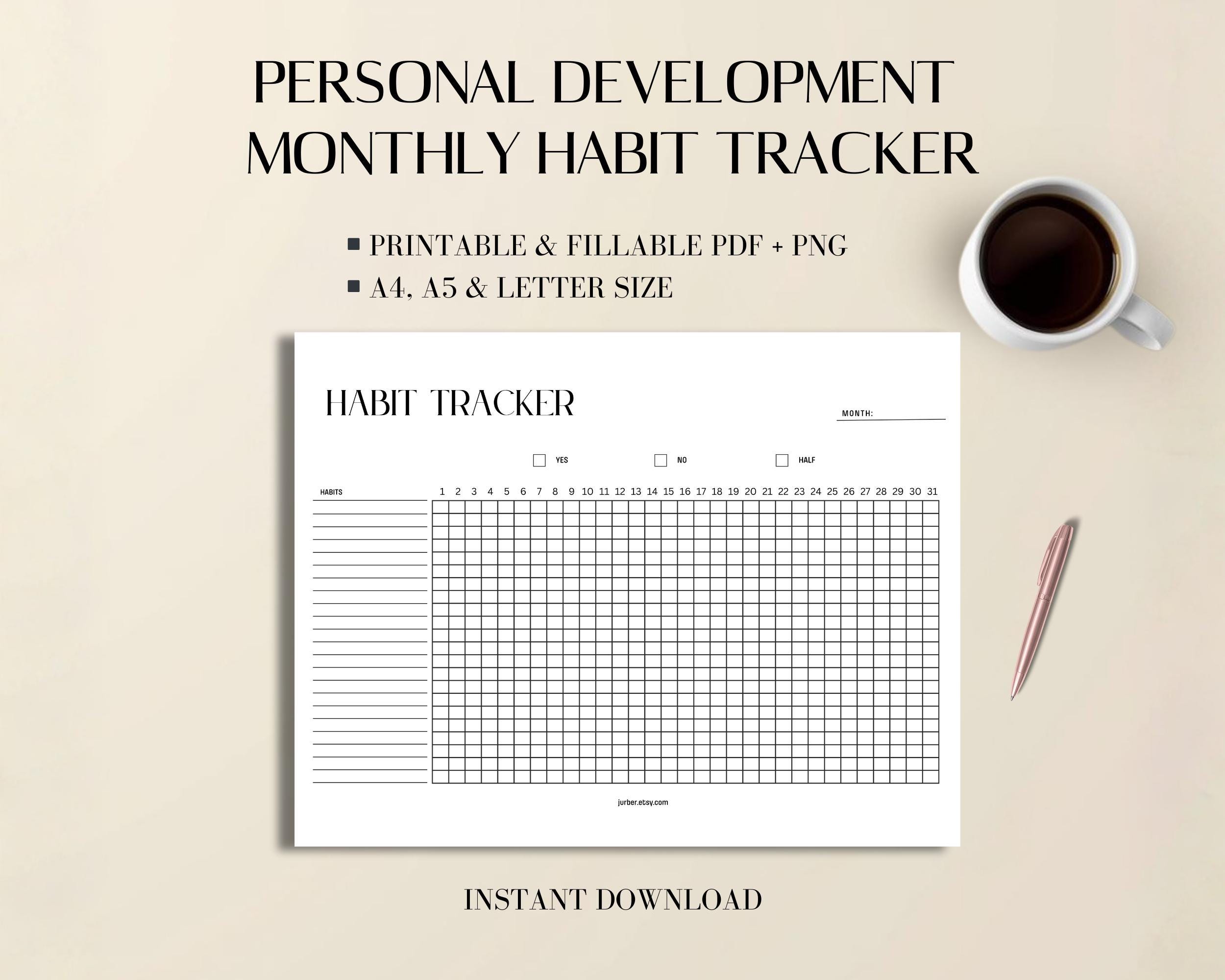 Personal Development Monthly Habit Tracker | Printable, Fillable PDF & PNG | Minimal 30 Day Planner