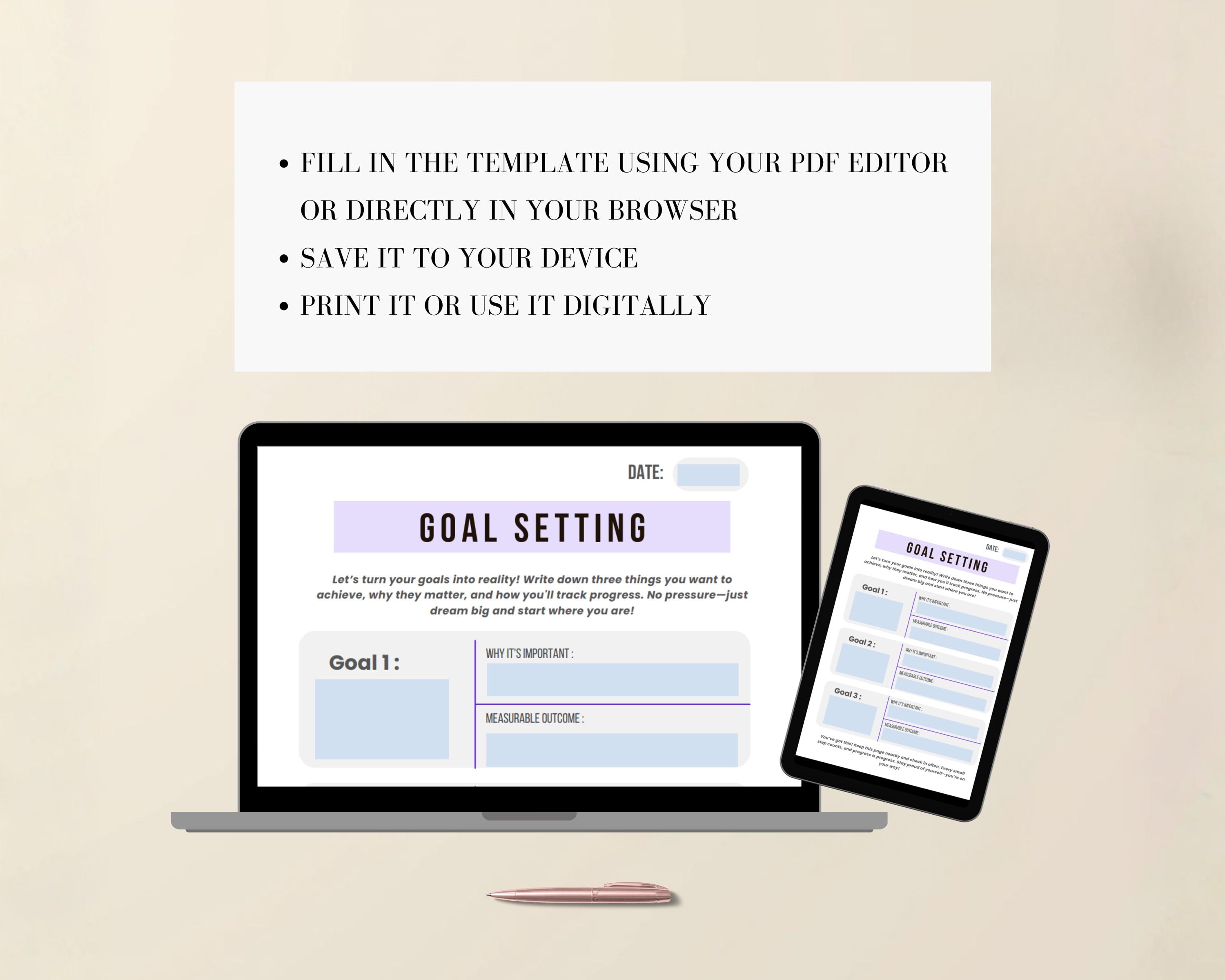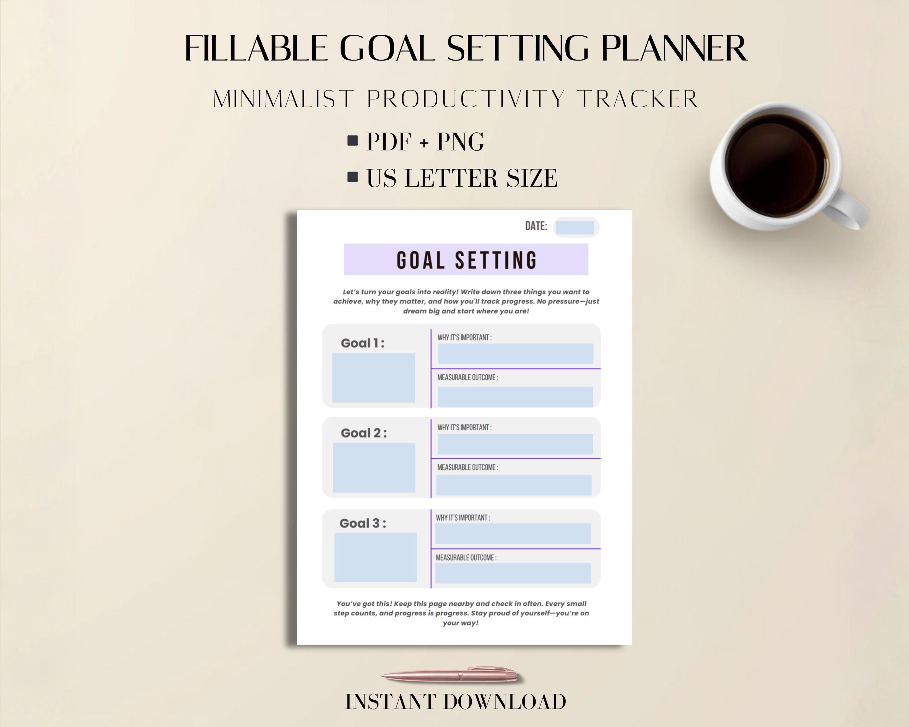 Fillable Goal Setting Planner | Minimalist Productivity Tracker | PDF + PNG