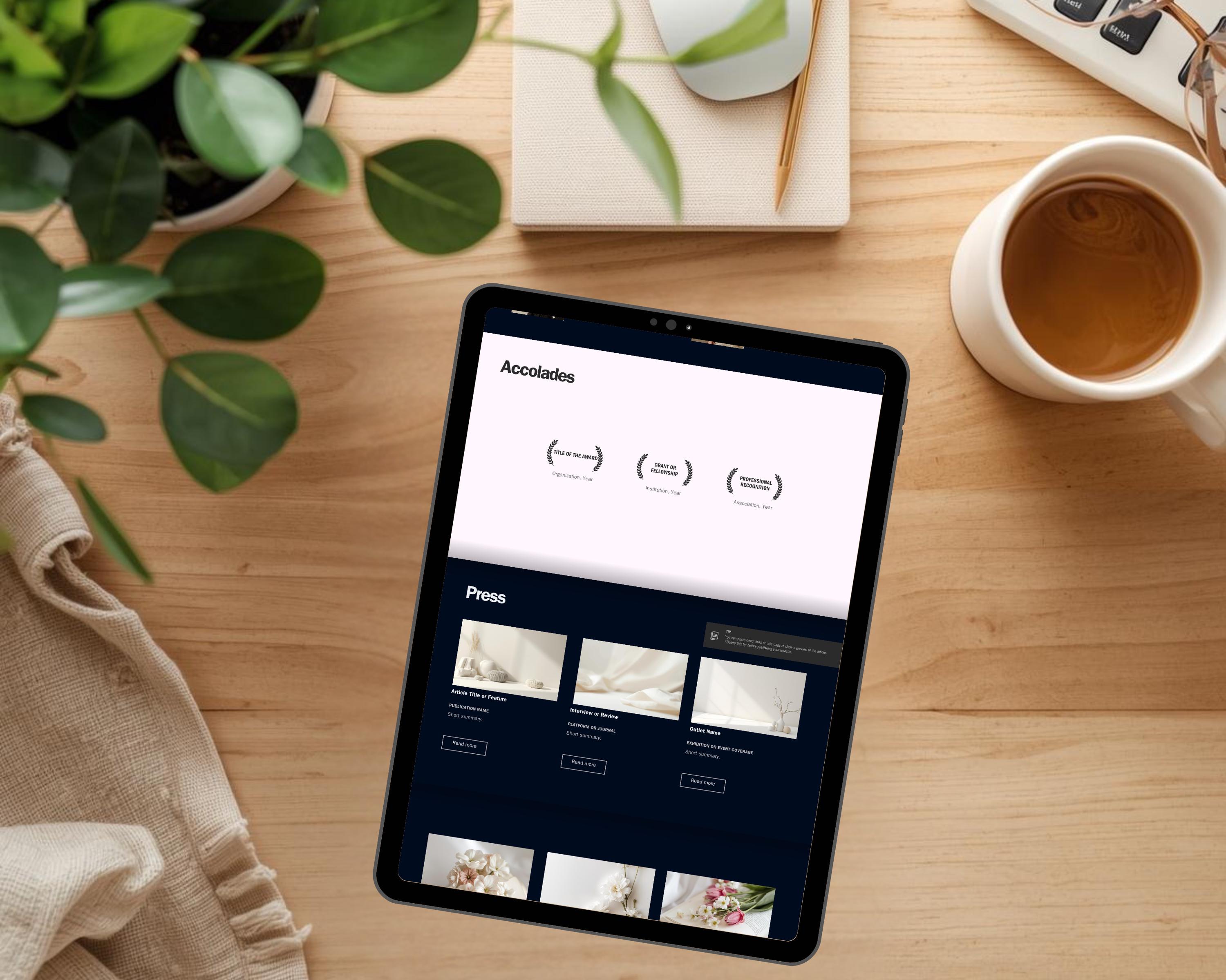 Whether you’re building a creative portfolio, writer portfolio, researcher portfolio, or consultant portfolio, this one page website template helps you show your published work, client projects, research, awards, education, or press mentions in a neutral color site with a creative web layout. You don’t need to hire a developer or write code — just use the drag drop canva kit to get started.