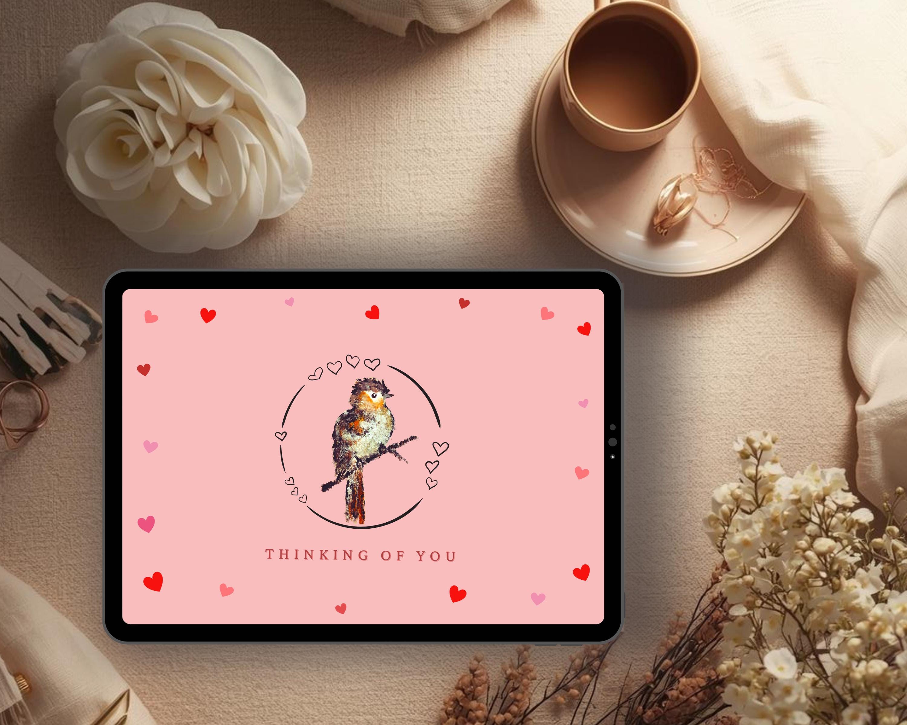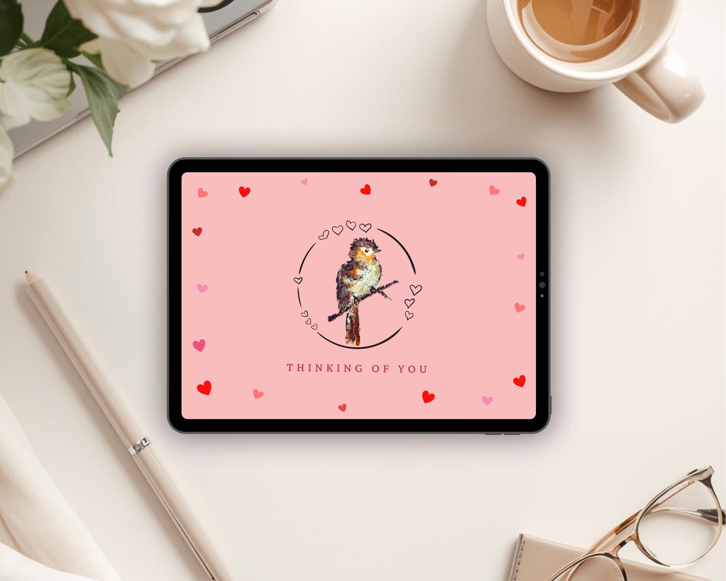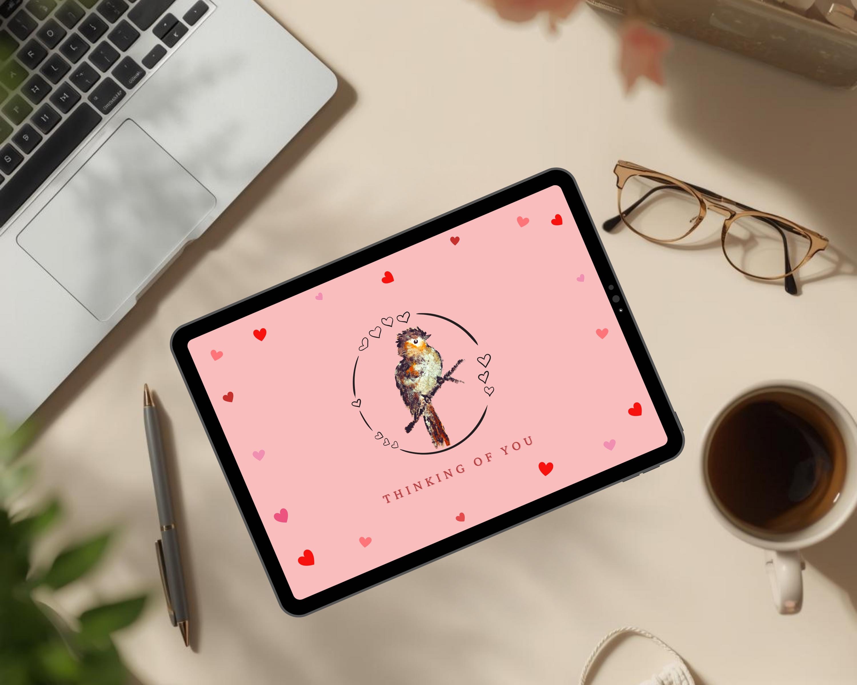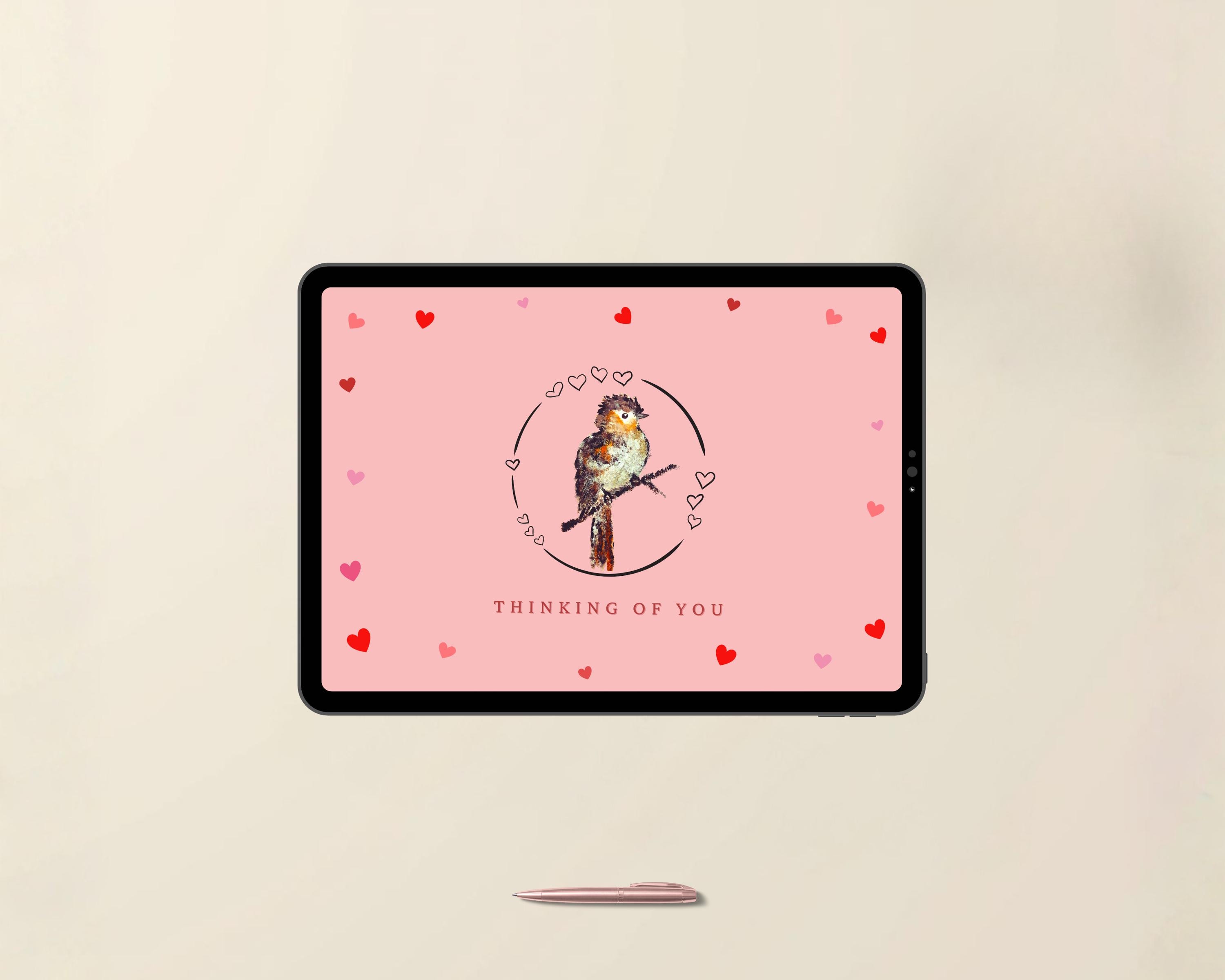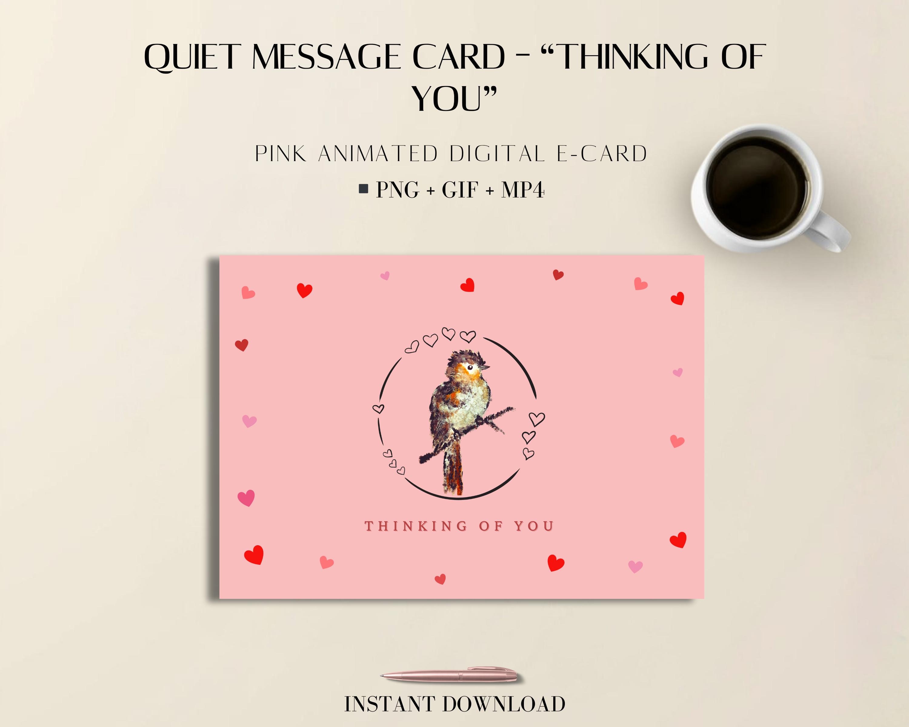 With a soft pink palette, flying hearts, and a calm watercolor bird, this animated postcard feels warm and easy to receive. The design features a hand painted card and includes a human made animation, with no AI artwork or stock assets used. You’ll find flying hearts in the animated heart card, capturing your intentions with a gif thinking card and a hand painted gif.