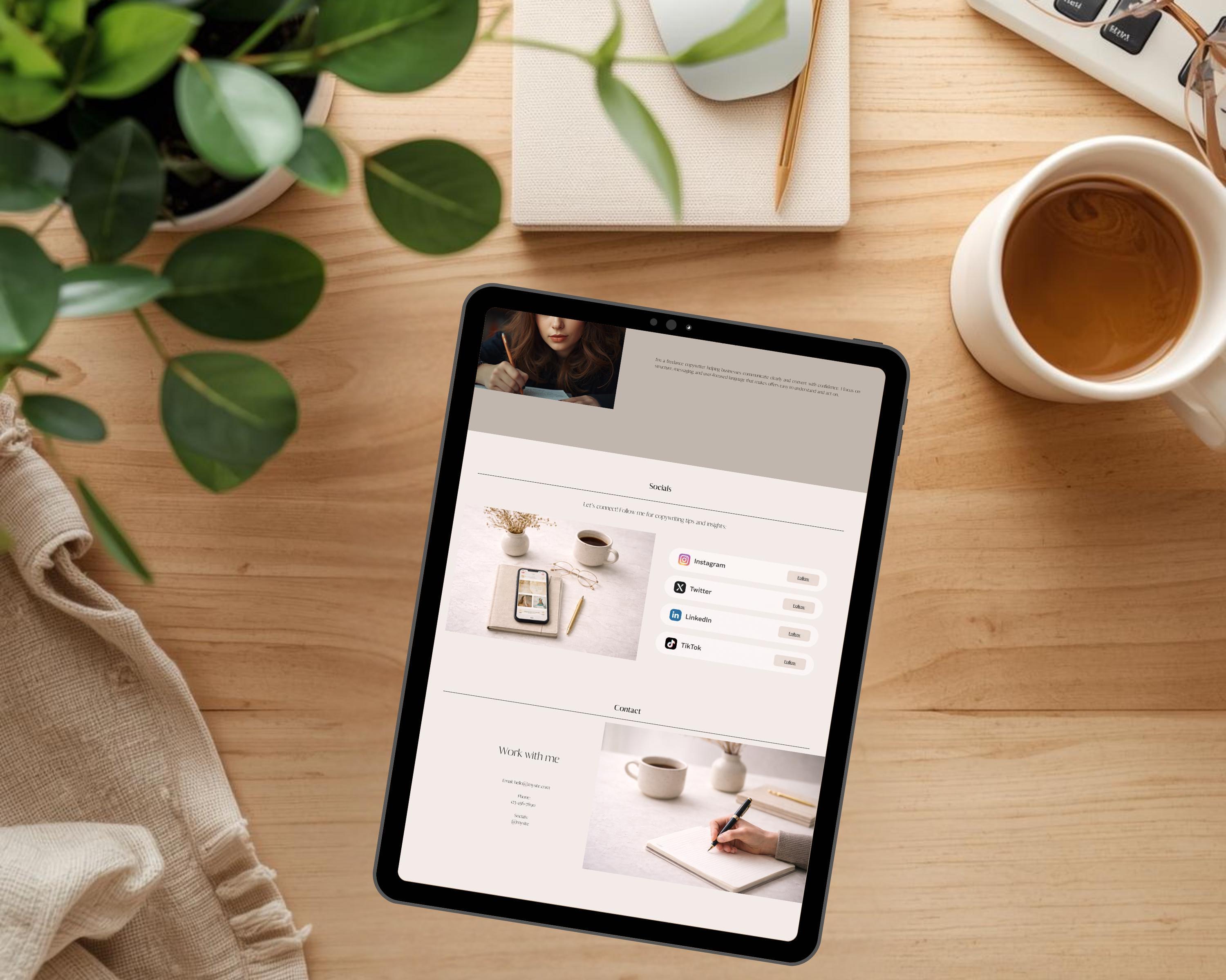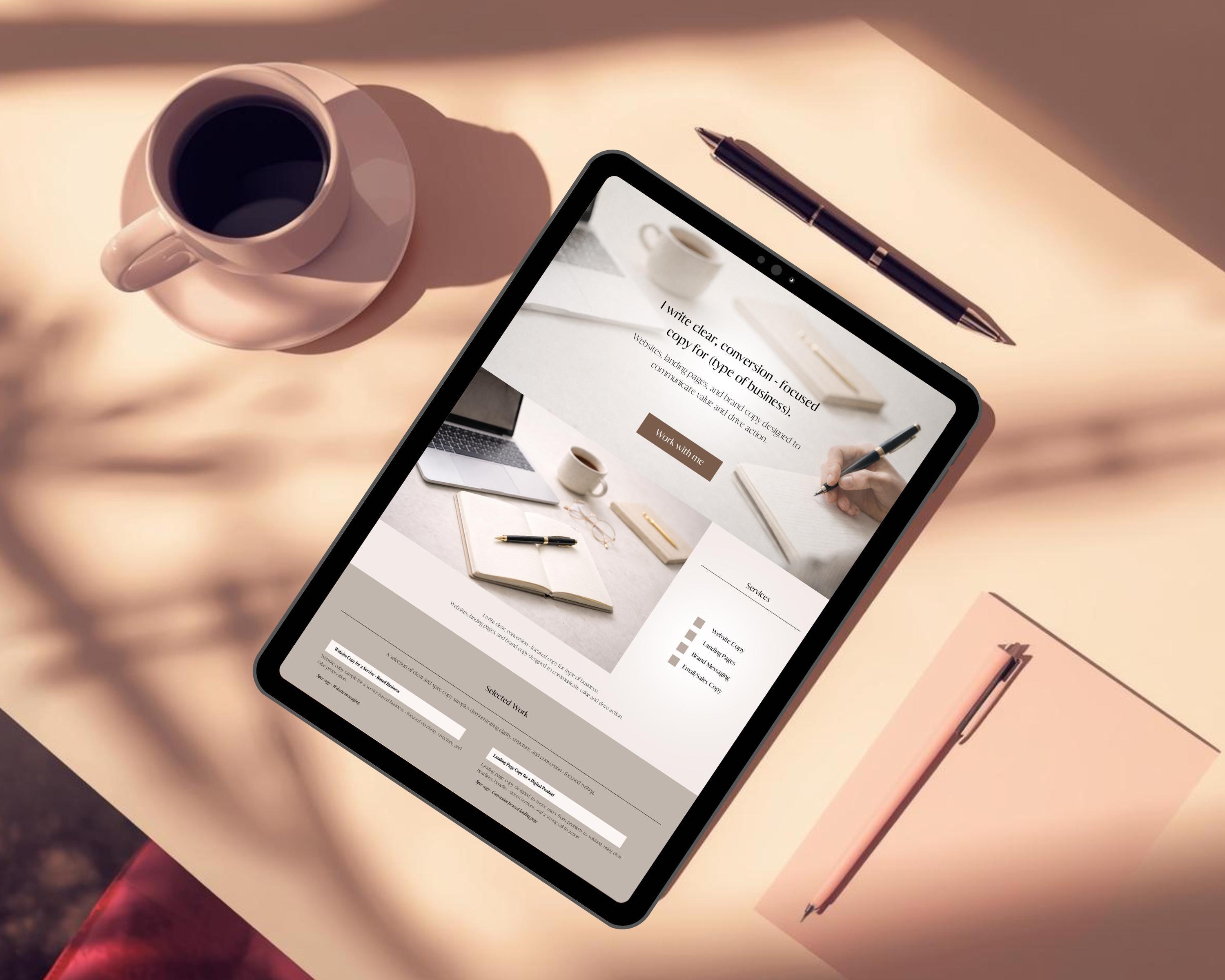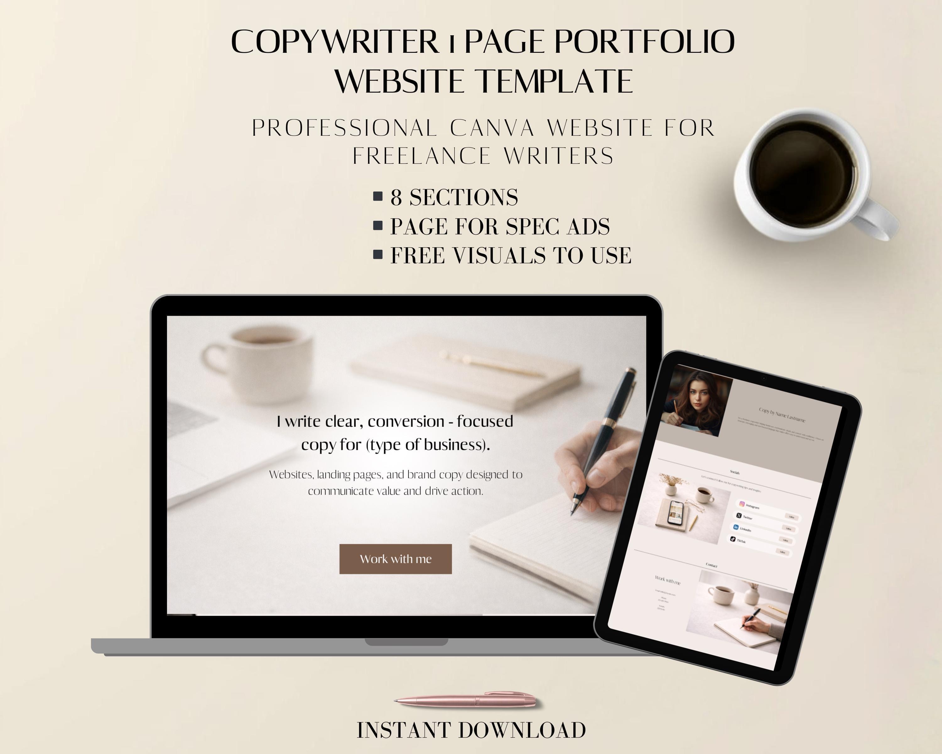 This copywriter 1 page portfolio website template is designed for freelance writers who need a clean, professional way to present their services, writing samples, and expertise — without building a full website.