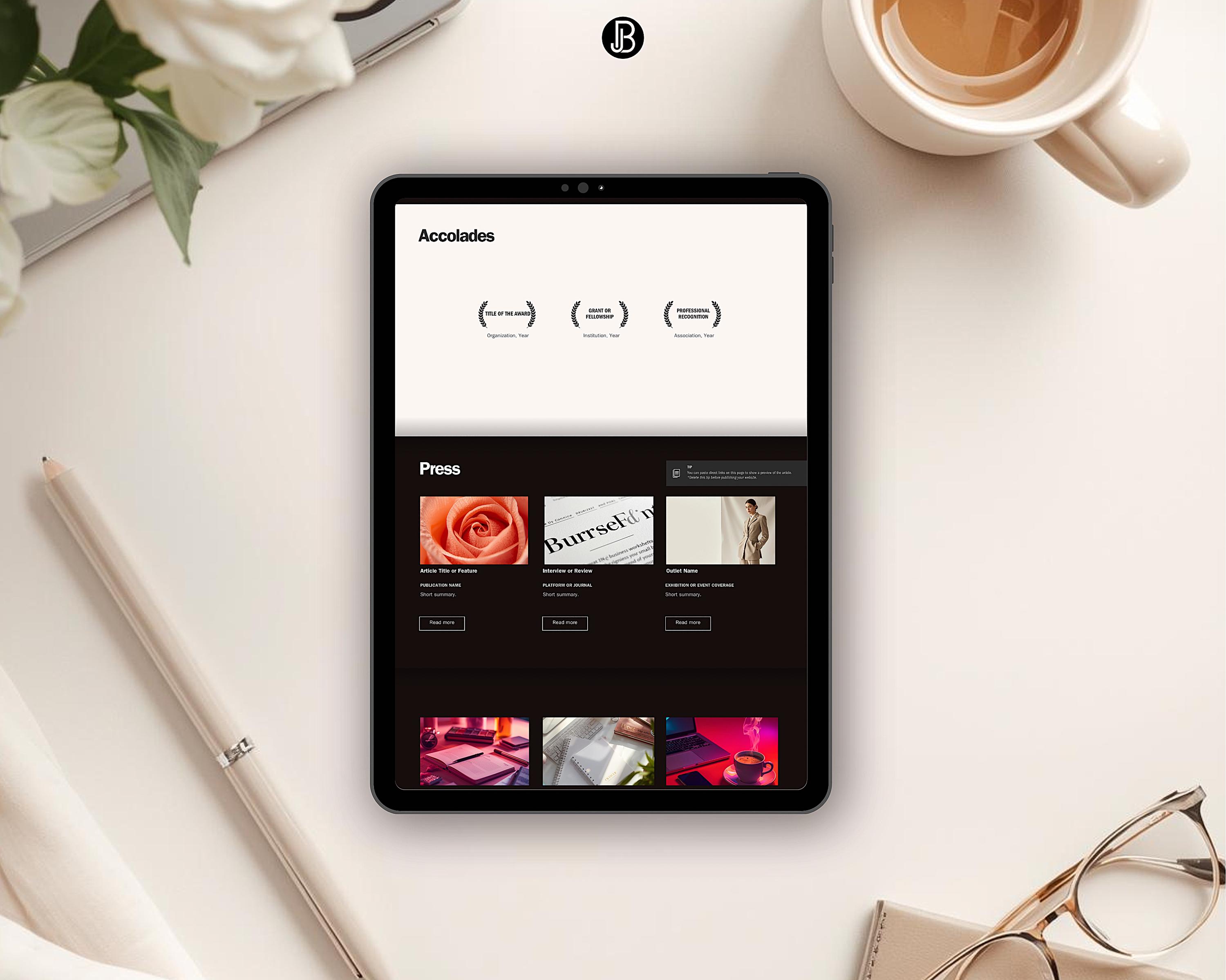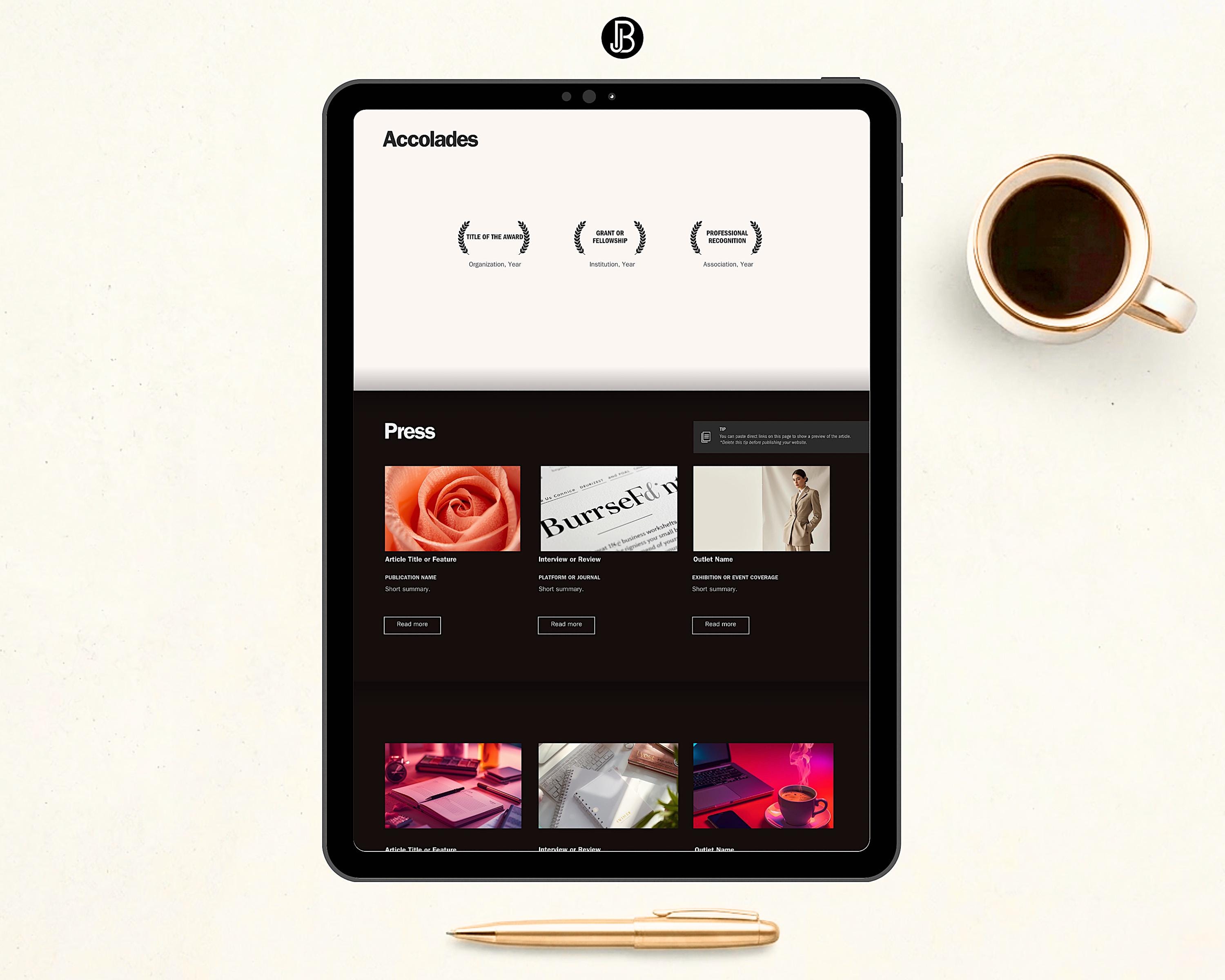 9. Press Page 1: Feature media mentions and interviews.